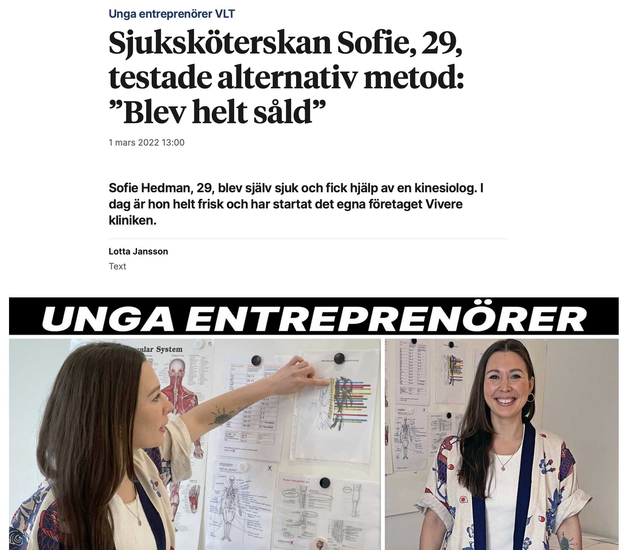 Det är alltid lika roligt att följa våra fantastiska elevers framsteg. Ibland går det extra snabbt. Sofie Hedman har redan fått framgång med sin Vivere klinik. Sofies intresse för yrket Kinesiolog kom i och med att hon själv tillfriskande efter ett besök hos en Kinesiolog. Hon tyckte det var så magiskt att hon själv ville bli Kinesiolog. Hon går just nu i vår fjärde yrkesklass och tar examen som färdigutbildad Kinesiolog i juni.